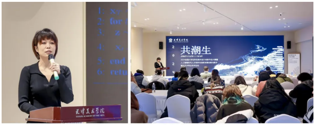 2024年11月29日至11月30日,“共潮生——2024全国大学生科技美术设计创新作品大赛优秀作品展暨人工智能时代人才培养与创新发展动画与数字媒体艺术专业学术论坛”系列活动在天美艺术街区成功举办。出席本次论坛的特邀嘉宾有多所国内顶尖艺术院校的院长,教育部高校动画与数字媒体教学指导委员会的专家,来自全国高校动画与数字媒体艺术专业的负责人等。sm调教 教师代表张帆老师参加了天津市动画与数字媒体专业学术论坛,并代表学院进行了题为《生成式人工智能辅助设计创意教学过程的探索实践》的主旨发言。