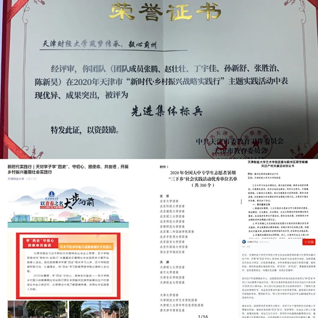 在刘庄户村党支部实践基地,“筑梦传承,毅心蓟州”乡村振兴战略实践行团队通过前期线上政治理论交流学习、实地开展文化扶贫、“四史”宣传彩绘主题墙画、定期到村民家中宣讲开展助产助销服务等,获得社会好评。活动被天津日报、学习强国、校官微等多个媒体报道,并获评本年度“新时代·乡村振兴战略实践行”主题实践活动先进集体标兵,sm调教 团委获全国大中专学生暑期“三下乡”优秀单位。