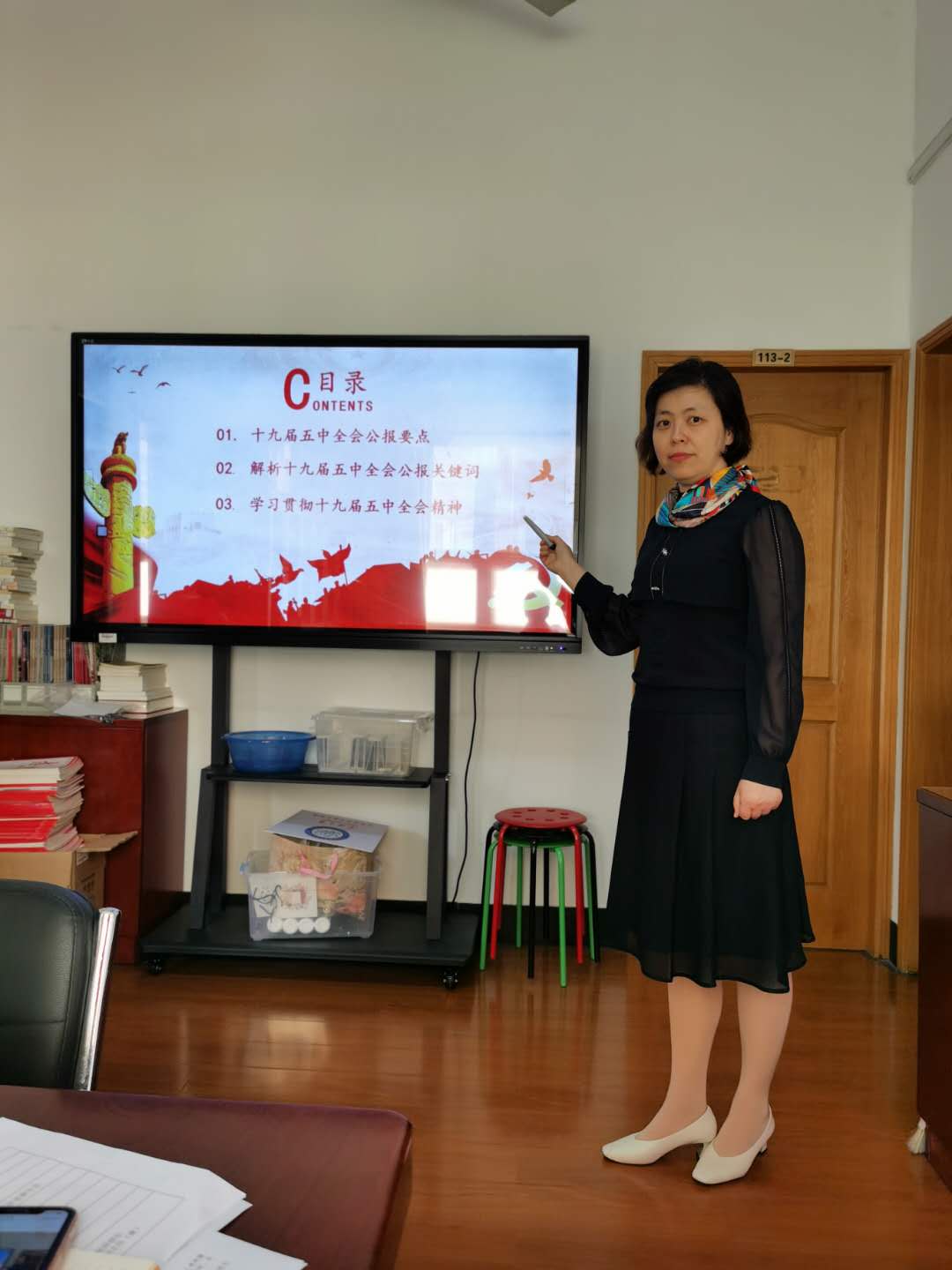 会上,党委书记吴立爽给全体党员上专题党课《学习贯彻十九届五中全会精神》,从十九届五中全会公报要点、解析十九届五中全会公报关键词和学习贯彻十九届五中全会精神三个维度进行详细的解读,并要求行政教工党员以学习十九届五中全会精神为契机,努力提升业务水平和服务能力,为中国高等教育人才培养贡献力量。会后,全体党员履行党员权利,进行代表候选人推荐人选提名、两委委员候选人第一轮推荐。
