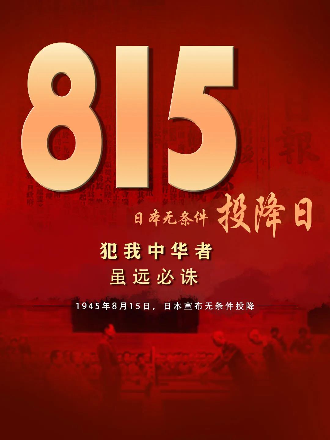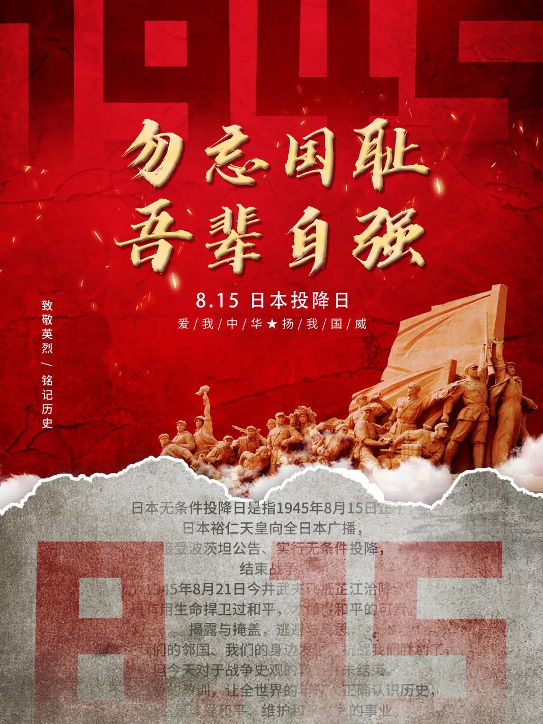76年前的今天,日本宣布无条件投降。14年山河不屈,14年浴血奋战,中国人民以铮铮铁骨战强敌,以血肉之躯筑长城,以前仆后继赴国难,谱写了惊天地、泣鬼神的雄壮史诗。每每想到日本侵华的种种恶行,我们的心情都无法平静。我们要铭记惨痛的历史与国耻,作为新时代的青年人要牢记爱国精神。勿忘历史,吾辈自强。