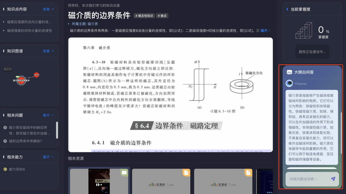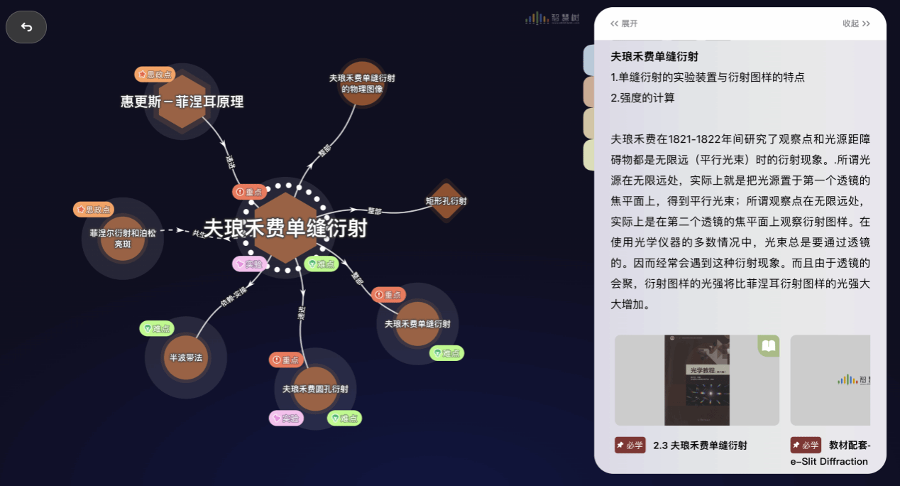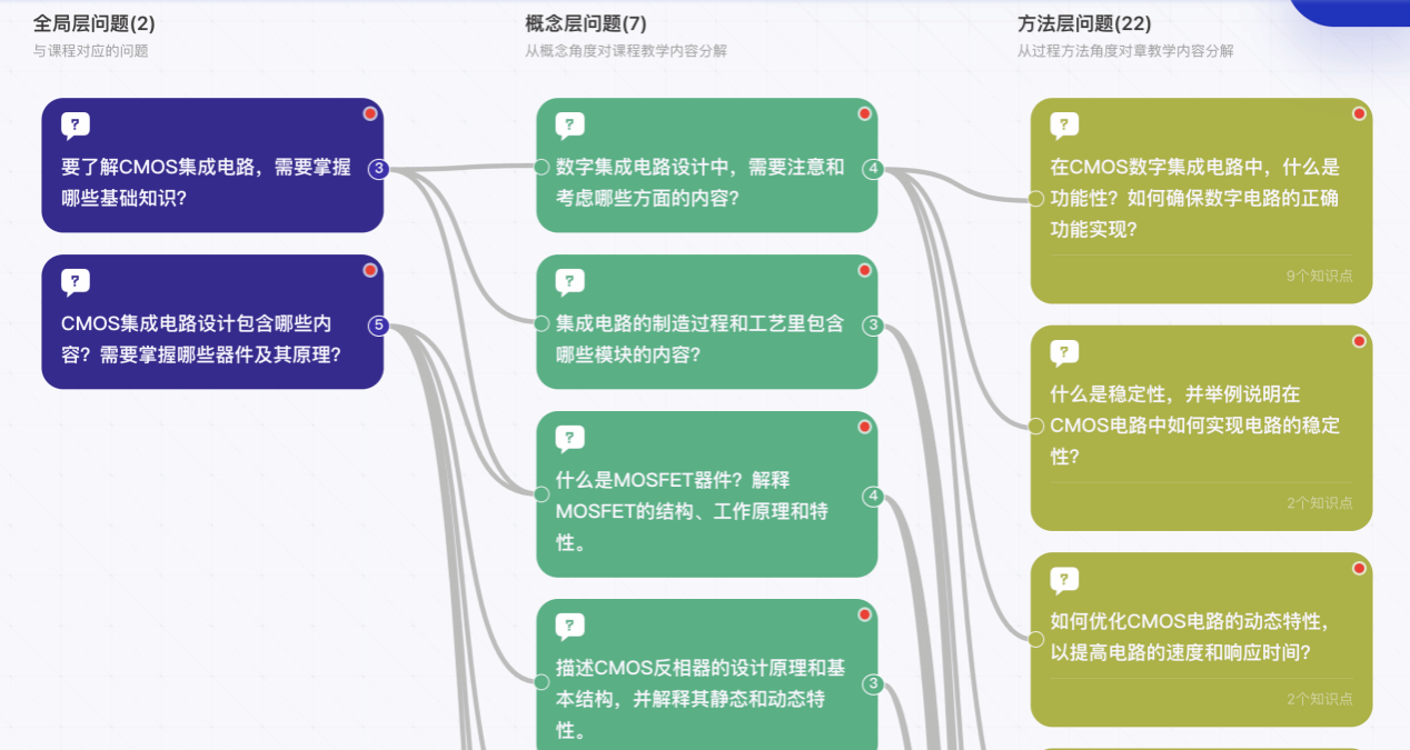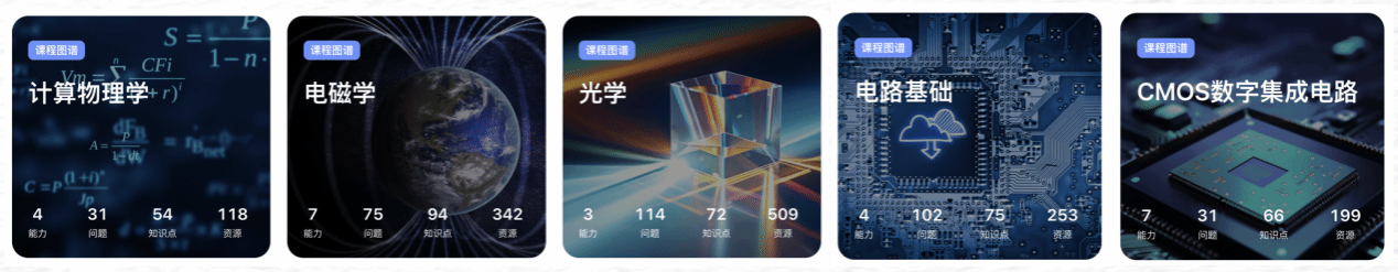 在知识图谱AI课程筹划和建设的过程中,各课程团队成员和智慧树团队一起研讨教学创新亮点,他们运用丰富的案例、互动讨论和在线实验等方式,让学习过程既富有挑战性又充满乐趣。团队聚焦课程目标、知识框架、学习逻辑等关键问题,拆解、细化专业知识。结合教学实施情况,“电磁学” 知识图谱AI课程系统搭建了7项能力目标,梳理了75个问题,94个知识点,构建了150个知识关系,拓展了342个教学资源;“计算物理学” 知识图谱AI课程系统搭建了4项能力目标,梳理了31个问题,54个知识点,构建了149个知识关系,拓展了118个教学资源;“光学” 知识图谱AI课程系统搭建了3项能力目标,梳理了114个问题,72个知识点,构建了156个知识关系,拓展了509个教学资源;“电路基础”知识图谱AI课程系统搭建了4项能力、梳理了102个问题,75个知识点,构建了131个知识关系,拓展了253个教学资源;“CMOS数字集成电路”知识图谱AI课程系统搭建了7项能力目标、梳理了31个问题,66个知识点,构建了127个知识关系,拓展了199个教学资源。每门知识图谱AI课程均包含教学资源层、知识体系层、问题体系层、能力体系层等4个维度,将每门课程的知识点有机地联系在一起,形成了一个完整的、多维度的知识网络,帮助学生全面掌握课程知识体系,加强对sm调教