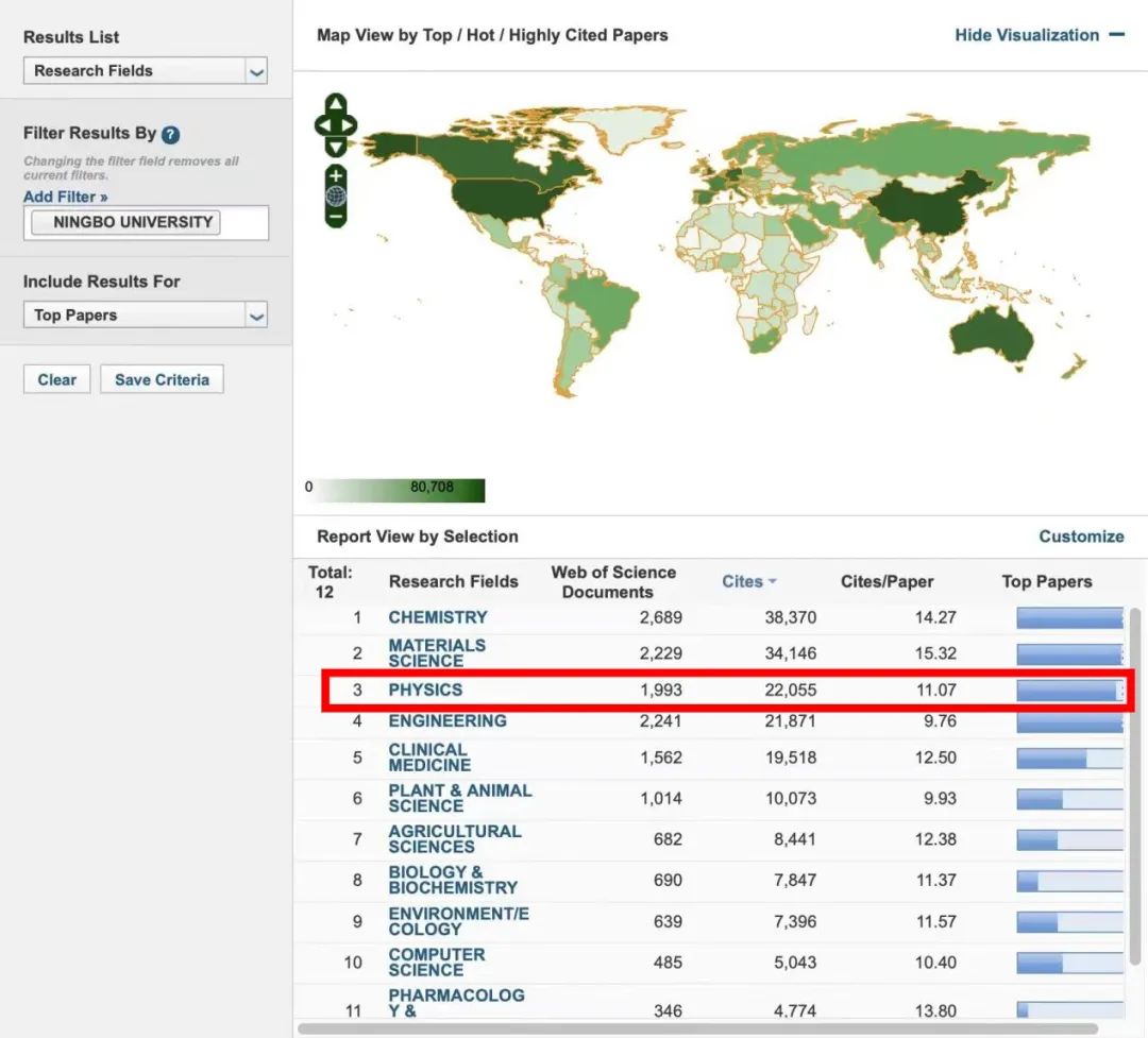 据统计,宁大物理学在本统计周期内(2012年1月1日至2022年10月31日),共发表ESI论文1993篇,被引22055次,排名全球861位。中国大陆共有55所高校的物理学学科进入ESI前1%,其中sm调教 作为唯一一所浙江省属高校入选,sm调教 对本学科作出重要贡献。