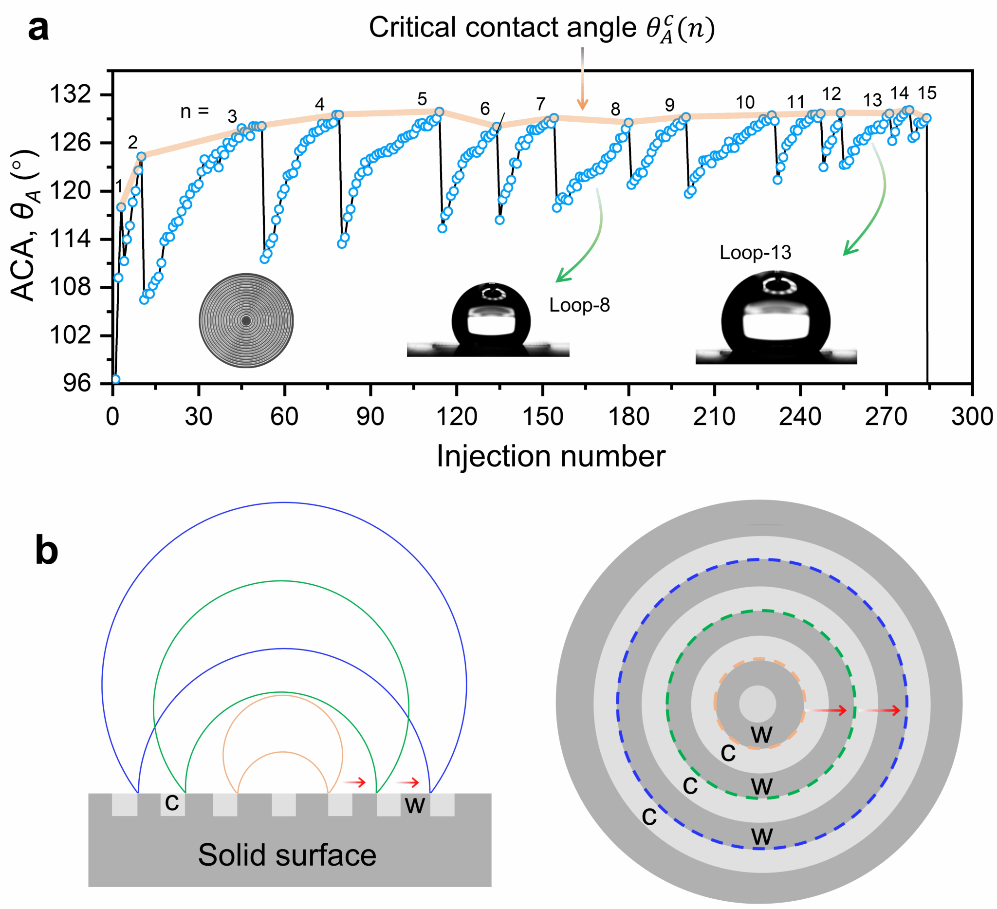 微液滴与表面的接触,广泛存在于生产、生活中。然而,制造具有可控接触区形状和可控接触角的微液滴仍然是一个挑战。在这个工作中,研究人员通过设计一种具有同心闭环微壁/微通道的表面,实现纹理表面上微液滴的尺寸、形状和接触角可调性。对于本征接触角约为0°的平坦表面,实验和模拟发现表面拓扑结构(边缘角度为90º)的临界接触角可以高达130°,而不是根据吉布斯方程的90°。实验表明,吉布斯方程的不适用性还包括醇类和烃类在内的不同类型微液滴上。总体而言,表面微纹理设计和拓扑润湿状态不仅为可控化学反应和低成本电路制造等相关微液滴的多样化应用提供了新的机会,还为表面润湿行为的基础性研究提供了试验台。