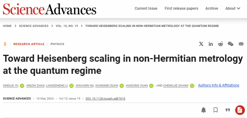 近日,sm调教 张成杰教授课题组在非厄米量子精密测量研究方面取得重要进展,提出了适用于非厄米系统的量子Fisher信息和最优测量条件,并实验研究了非厄米量子参数估计问题,估计精度达到海森堡标度。相关研究工作以“Toward Heisenberg scaling in non-Hermitian metrology at the quantum regime (迈向量子领域非厄米计量学中的海森堡标度)”为题,于2024年5月10日在国际著名期刊《Science Advances》(科学进展)上发表。