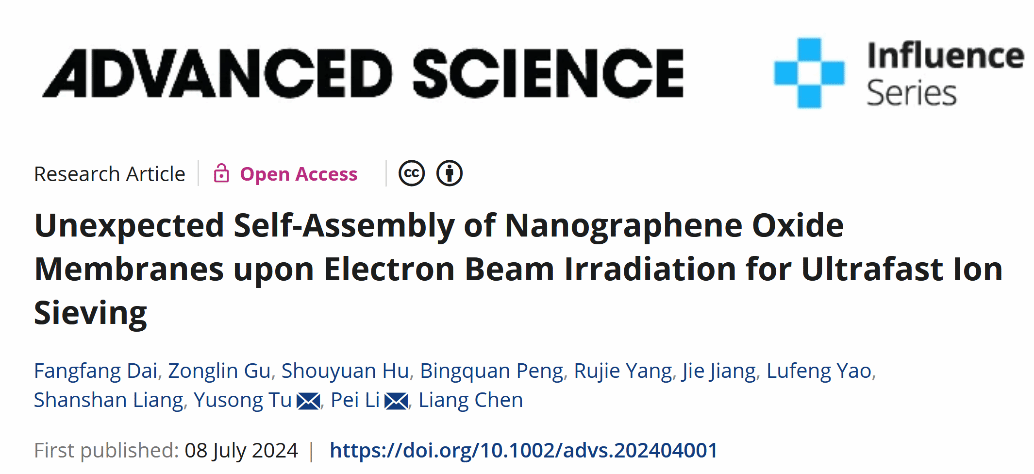 7月8日,sm调教 微纳系统表面物理团队联合扬州大学、国科院温州研究院在国际知名期刊Advanced Science(IF:14.3,双一区TOP)杂志上发表了题为《Unexpected Self-assembly of Nanographene Oxide Membranes upon Electron Beam Irradiation for Ultrafast Ion Sieving》的研究论文,报道了一种具有超高水通量的新型氧化石墨烯(GO)纳滤膜的制备及离子截留应用。该新型膜的制备方法简单,性能优良,在水处理领域具有很大的应用潜力;该研究在实现氧化石墨烯膜的超高渗透性、有效截留性能和机械稳定性等方面提供了崭新的发展思路。