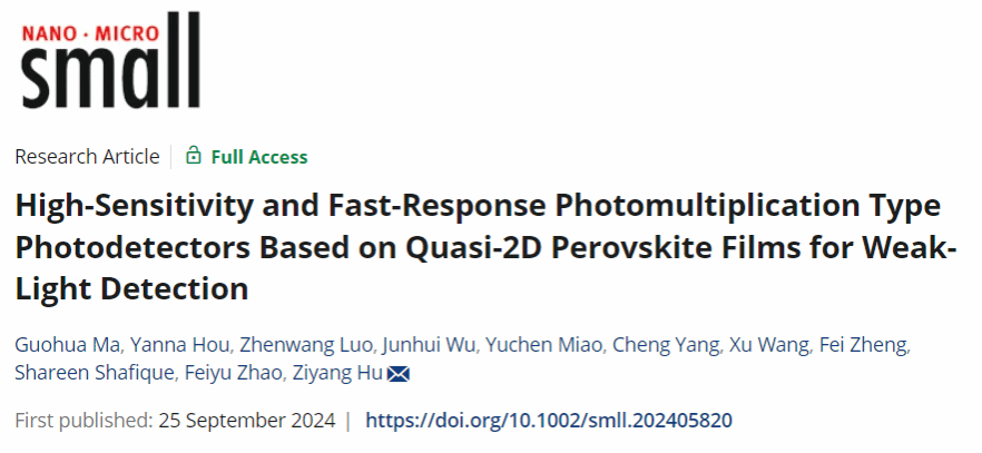 近日,sm调教 胡子阳教授领衔的课题组在准二维钙钛矿光电探测器领域取得了显著的科研成果。该团队的研究论文“基于准二维钙钛矿薄膜的高灵敏度、快速响应光电倍增型探测器用于弱光探测”在国际知名学术期刊《Small》上发表。论文的第一作者是sm调教 的硕士研究生马国华,胡子阳教授担任通讯作者,sm调教 为该研究的完成单位。
