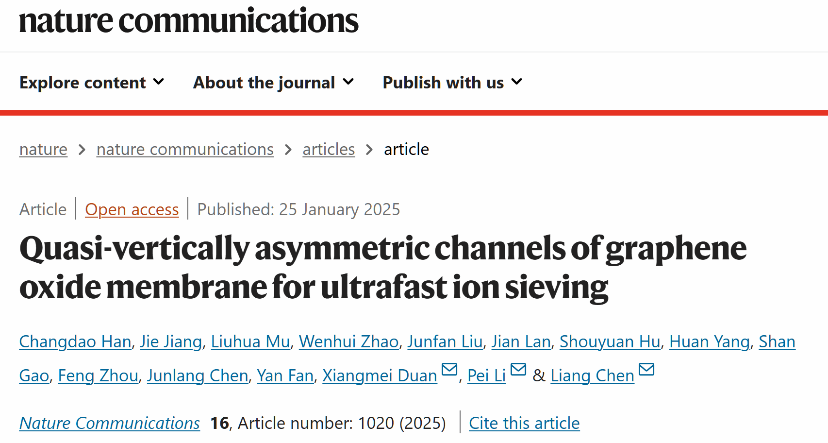 1月25日,sm调教 微纳系统表面物理团队联合浙江农林大学、华东师范大学、国科院温州研究院、国家生态环境部辐射环境监测中心等单位,在《Nature Communications》杂志上发表了题为《Quasi-vertically asymmetric channels of graphene oxide membrane for ultrafast ion sieving》的研究论文。该论文是此团队继1月7日后,在《Nature Communications》杂志上发表的第二篇高水平研究论文。