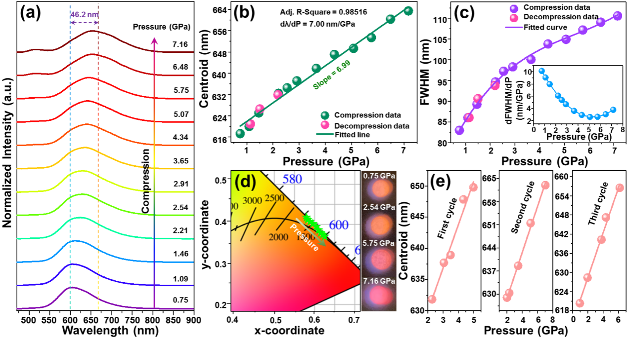 图1. 高压下Mn2+掺杂NaY9(SiO4)6O2红色荧光粉的光学特性。