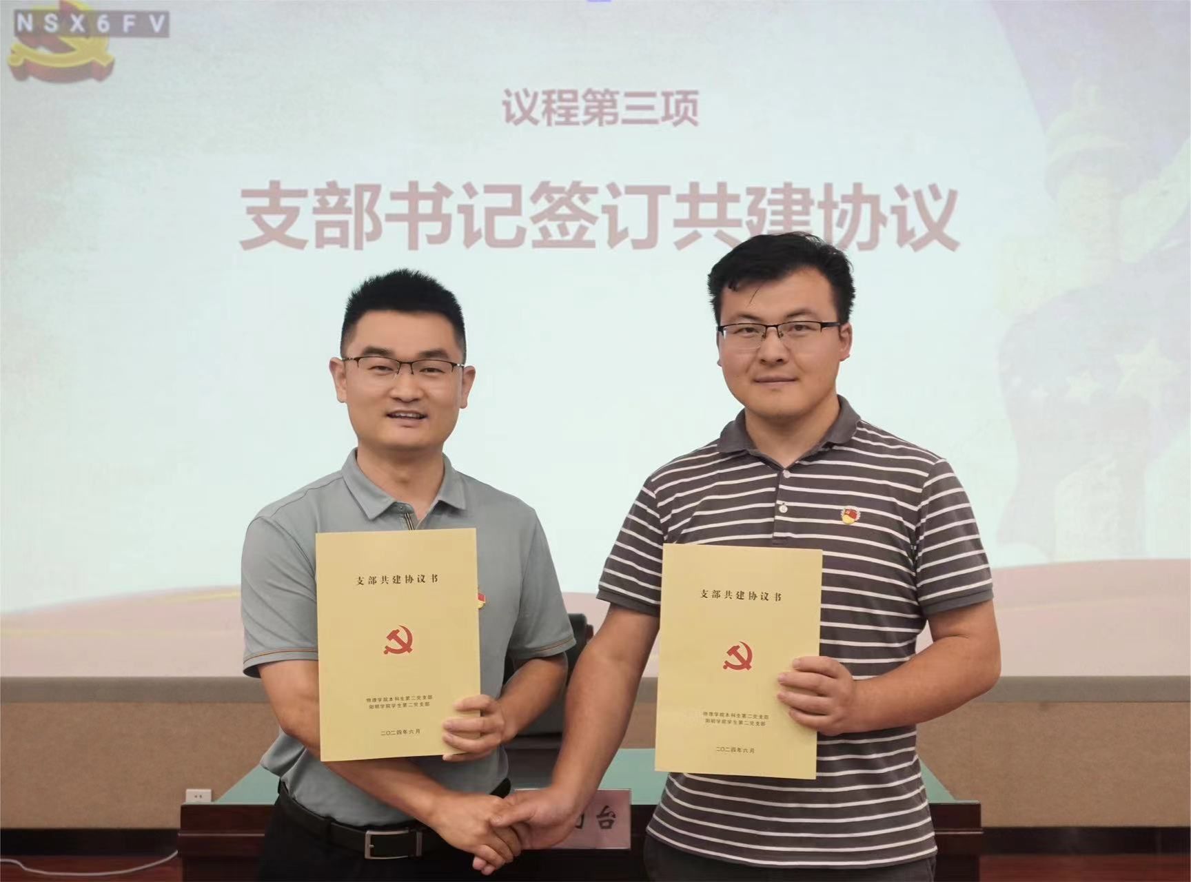 6月7日中午,物理sm调教 本科生第二党支部与阳明sm调教 学生第二党支部在北区杨咏曼楼举行了支部共建签约暨学习经验分享活动。阳明sm调教 党委副书记王立衡、物理sm调教 党委副书记刘小娣(线上)、物理sm调教 本科生第二党支部书记常文豪、阳明sm调教 学生第二党支部书记马晨旭及师生代表100余人参加了此次活动。活动由阳明sm调教 辅导员王顺顺主持。