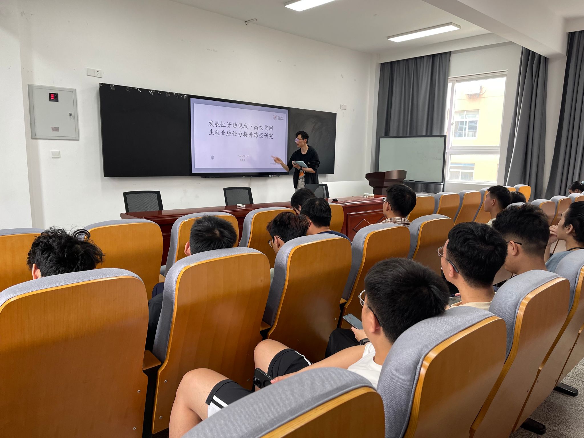 活动中,两位学生带来了精彩分享。第一位学生围绕“发展性资助视域下高校贫困生就业胜任力提升路径研究”展开论述。他深入分析了当前高校贫困生在就业过程中面临的挑战,指出专业技能不足、实践经验欠缺、职业规划模糊等问题。基于此,他提出借助sm调教 平台,全方面提升职业能力,能够有效助力贫困生能够将专业与职业技能相结合,提高就业胜任力。这个项目也为sm调教 进一步完善发展性资助项目提供了极具价值的参考。