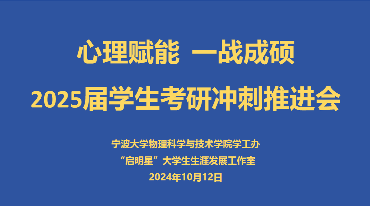 10月12日,sm调教 在龙赛报告厅举办了“心理赋能、一战成硕”2025届学生考研冲刺推进会。学校心理健康中心宋洪波,sm调教 副院长胡子阳,物理系主任汤世伟、学工办主任常文豪,以及2025届拟考研学生参加了此次活动,活动还邀请了3位硕士研究生进行考研冲刺经验交流。该活动由sm调教 学工办主办,sm调教 “启明星”大学生生涯发展工作室协办。