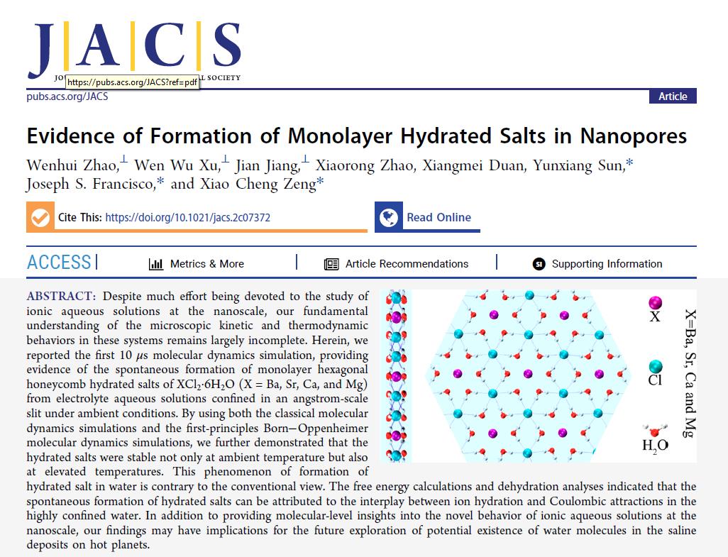 院士),在纳米限域环境内离子水溶液研究方面取得新进展,相关研究论文以“Evidence of Formation of Monolayer Hydrated Salts in Nanopores”为题发表在国际著名期刊J. Am. Chem. Soc.上,sm调教