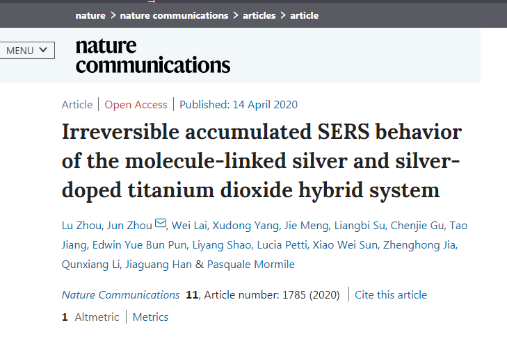 4月14日,sm调教周骏教授课题组在Nature子刊《Nature Communications》杂志发表题为“Irreversible accumulated SERS behavior of the molecule-linked silver and silver-doped titanium dioxide hybrid system”的研究论文。sm调教硕士周露为论文第一作者、周骏教授为通讯作者,sm调教